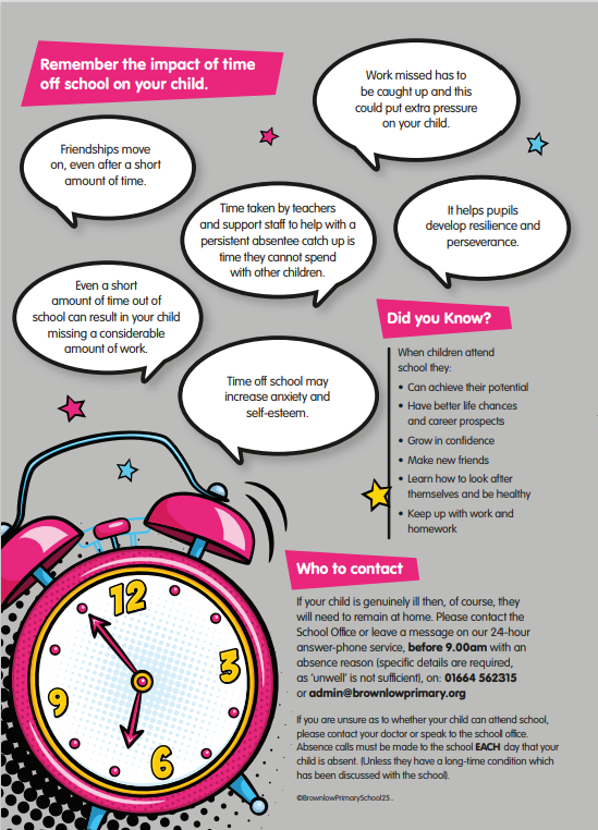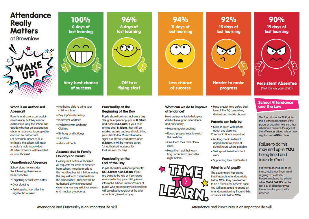 Brownlow Primary School is committed to ensuring that every child has access to a high quality educational experience which allows them to fulfil their potential. Attendance at school is a legal requirement and is important to a child’s social development and academic success.