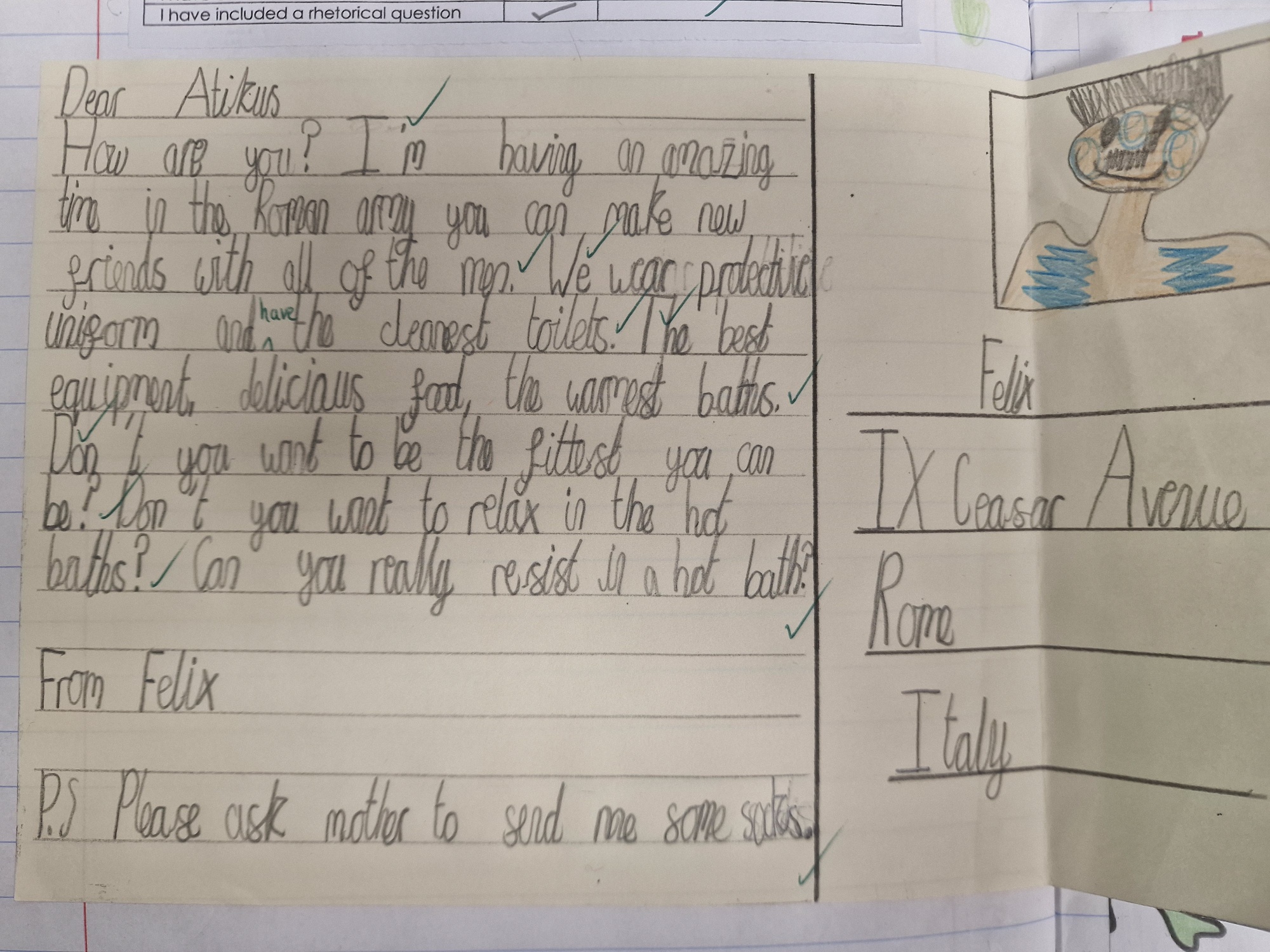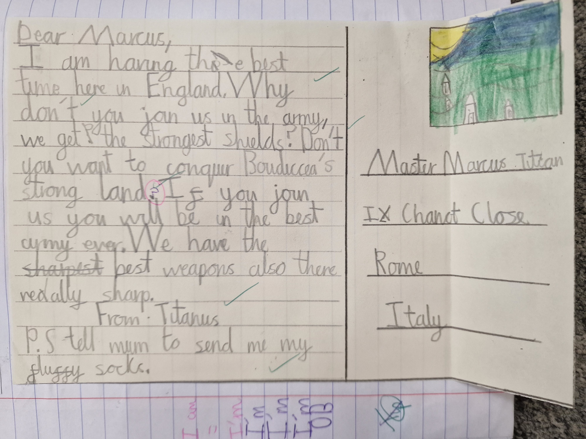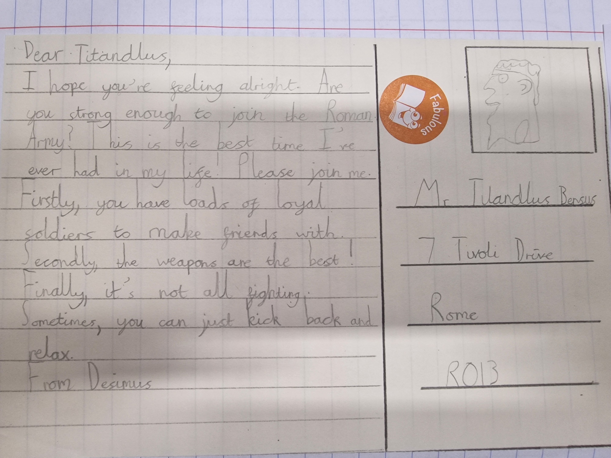 | The children have imagined what life was like as a Roman soldier and have written a postcard back to Rome persuading their friend to join the army. | |