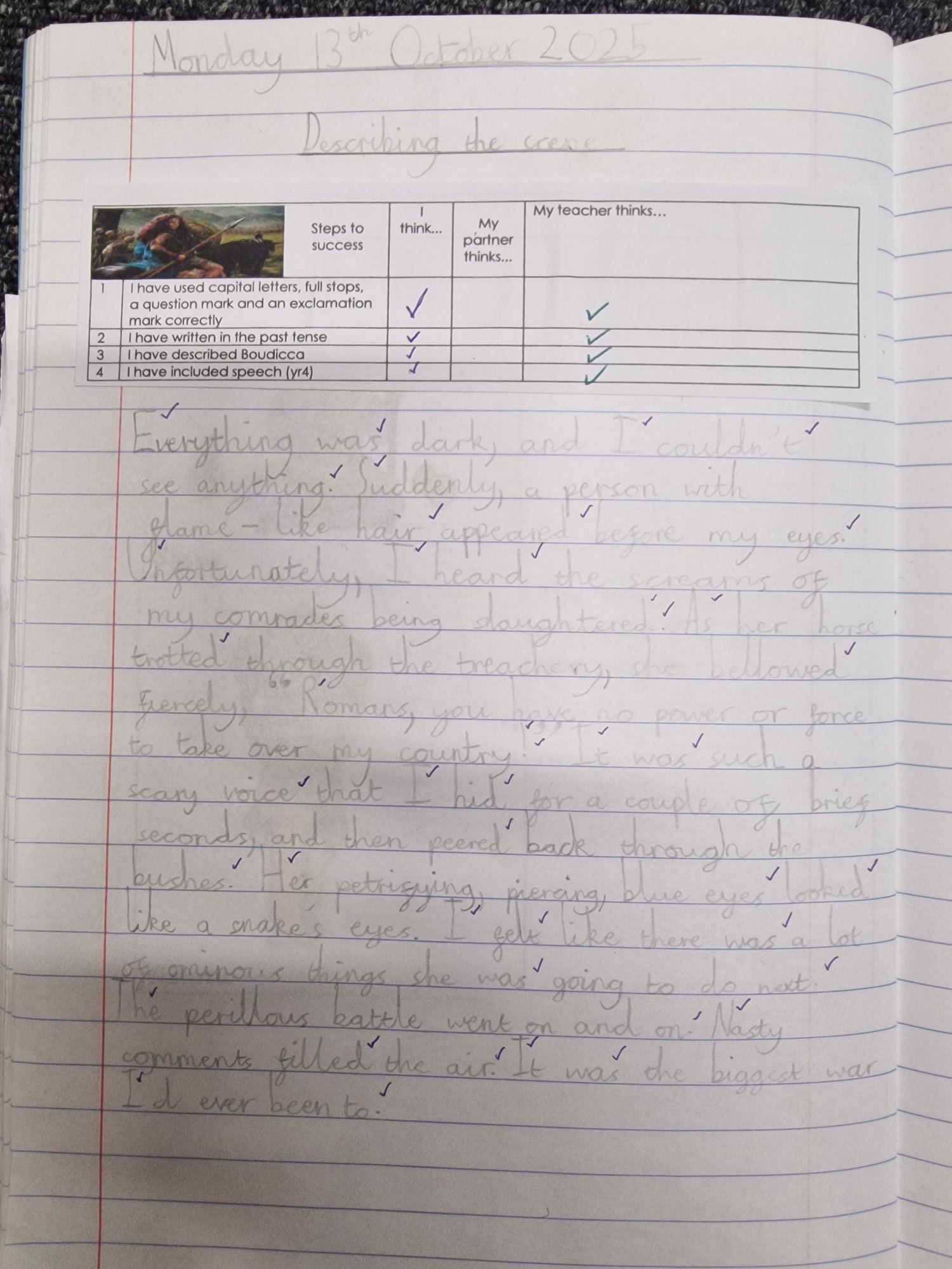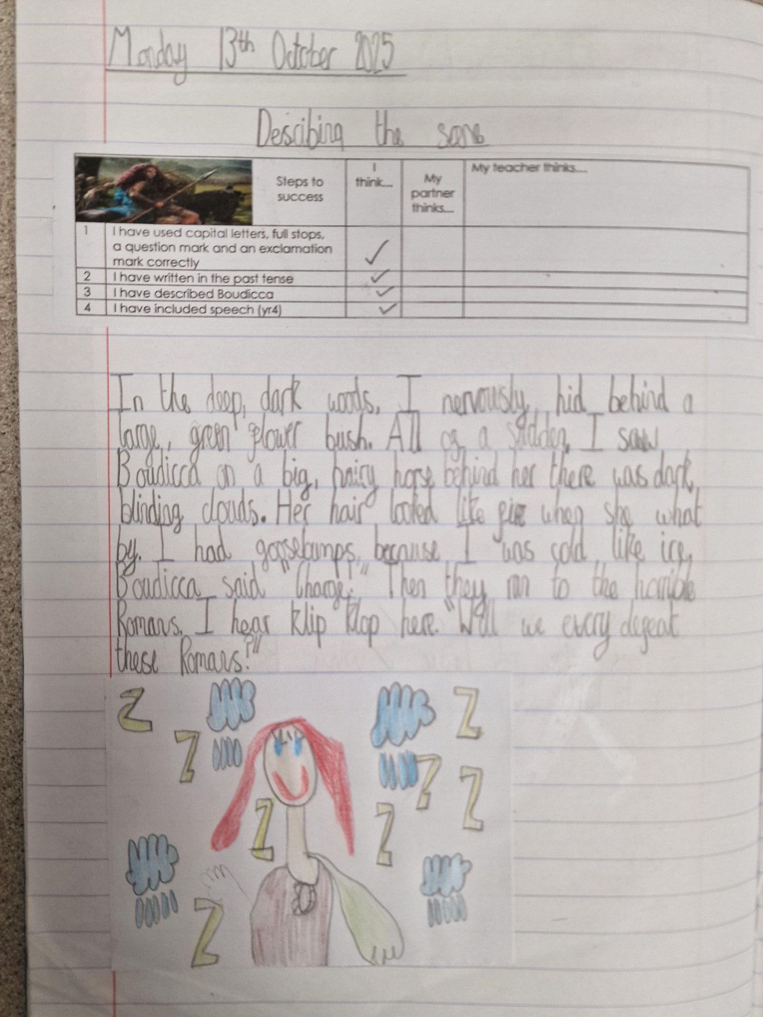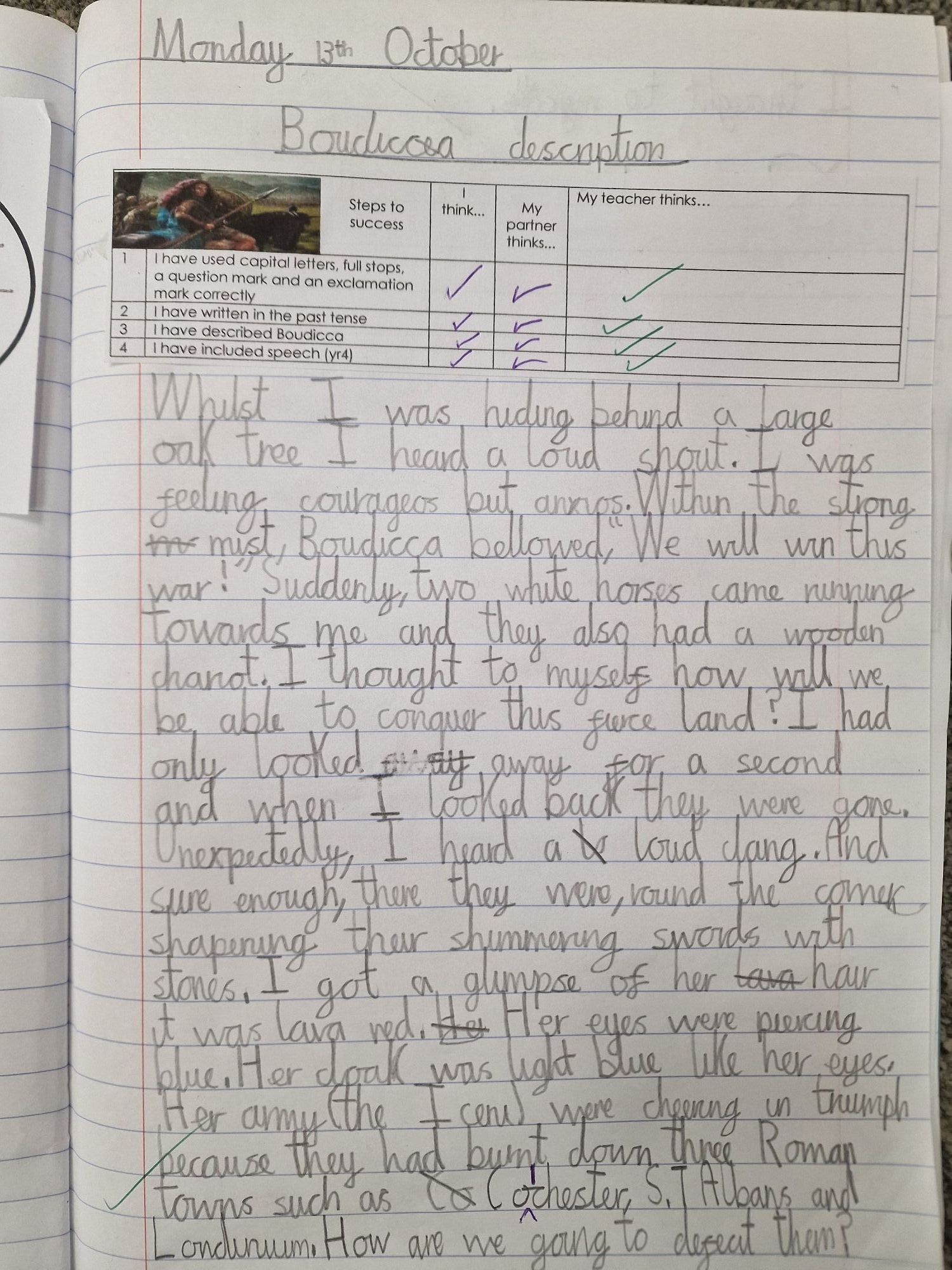 | In addition, they have learnt about the warrior Queen Boudicca and how she fought against the Romans. This has produced some excellent descriptive writing! | |